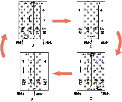 阶段C和D(图1 C和D):2号池停止进水,切换至4号和3号池进水,1号池出水。该阶段进水方向与内循环回流方向均和阶段A和B正好相反,但作用原理与阶段A和B完全一致。
