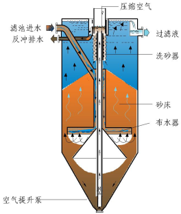 活性砂过滤池是基于逆流原理,原水通过进水管进入过滤器内部,经布水器均匀分配后向上逆流通过滤料层完成絮凝、过滤,滤液在过滤器上部聚集溢流外排。在此过程中,原水被过滤,水中的污染物含量降低,同时石英砂中污染物的含量增加,并且下层滤料层的污染物含量高于上层滤料。位于过滤器中央的空气提升泵在空压机的作用下将底层截留有污染物的石英砂提至过滤器顶部的洗沙器中清洗,清洗后返回滤床,同时将清洗所产生的污染物外排。如下图所示。